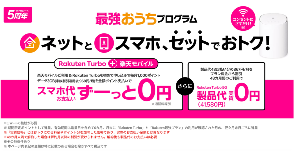 さらに、Rakuten Turboの製品代48回払い分の867円/月がプラン料金から割り引かれ、48ヶ月間のご利用でRakuten Turbo 5G 製品代(41,580円)が実質0円でご利用いただけます。